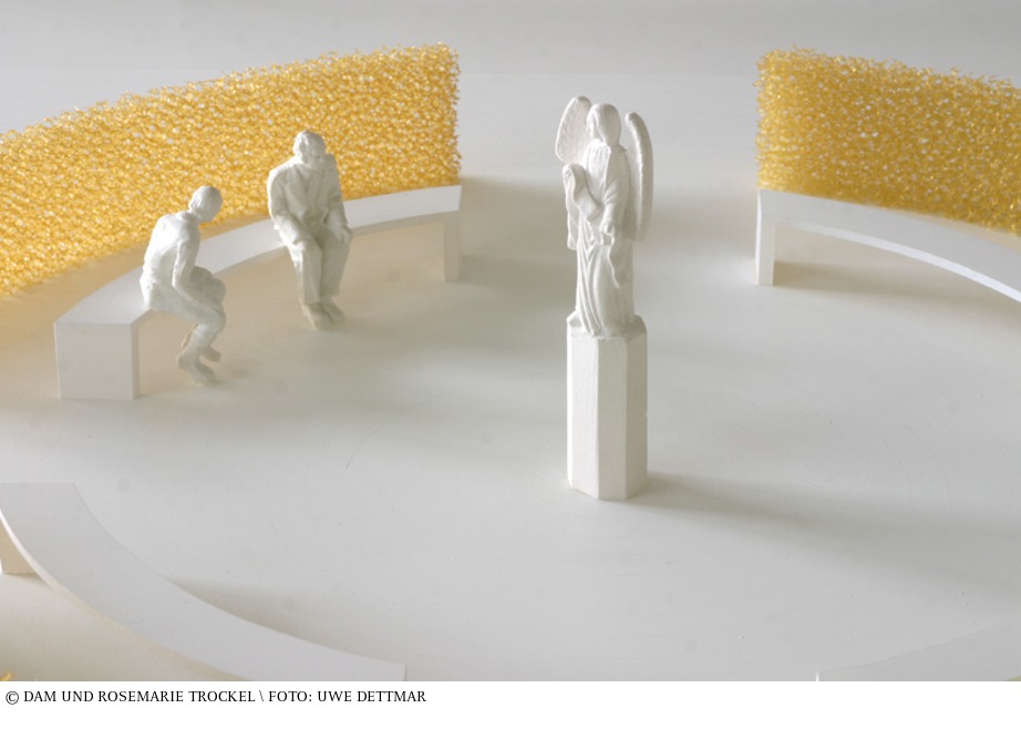 Nahe der Peterskirche auf dem Klaus-Mann-Platz steht seit dem 11.12.1994 ein Mahnmal mit einer Engelsskulptur für die im Dritten Reich ermordeten und verfolgten homosexuellen Frauen und Männer. Idee und Planung des Kunstwerks hatte die "Initiative Mahnmal Homosexuellenverfolgung e.V." in Frankfurt. Sie lobte 1992 einen Wettbewerb zur Gestaltung des Mahnmals aus. 1993 trat im Museum für Moderne Kunst die Jury des Wettbewerbs zusammen und entschied sich für den Entwurf von Rosemarie Trockel, einer der bedeutendsten deutschen Künstlerinnen, die sich mit ihrem vielschichtigen und philosophischen Werk bis heute jeder Zuschreibung entzieht. Der Platz ist kreuzförmig aufgeteilt, eingefasst von Buchsbaumhecken und vier Bänken, die zum Verweilen und Nachdenken einladen. In der Mitte steht die Engelsskulptur auf einem schmalen Sockel. Vorbild des Werks von Rosemarie Trockel ist ein Engel mit Schriftband, der ursprünglich als Giebelfigur zu einer Gruppe von 11 Engeln gehörte, die das Westportal des Kölner Doms schmückten. Das Original vom Ende des 19. Jahrhunderts existiert nicht mehr, lediglich ein lädiertes Gipsmodell. Dieses wurde im Maßstab 1:1 als Wachsabguss reproduziert. Trockel schlug dem Engel den Kopf ab und setzte ihn leicht verschoben wieder auf, so dass die Bruchstelle als Narbe sichtbar blieb. Von dem so veränderten Wachsabguss wurde die Skulptur in schwarz-patinierter Bronze zusammen mit einem achteckigen Sockel, der Bestandteil der Skulptur ist, gegossen. Vor der Gestaltung durch das Mahnmal war die Fläche als Platz kaum wahrzunehmen. Der Platz liegt in der Innenstadt und zugleich im Zentrum homosexueller Kultur und Subkultur. In unmittelbarer Nähe befindet sich das Gebäude des Frankfurter Gerichts. Damit verweist das Mahnmal auch auf die Rolle der Justiz bei der Verfolgung von Homosexuellen. aus: Initiative Mahnmal Homosexuellenverfolgung e. V (Hrsg.): Der Frankfurter Engel - Mahnmal Homosexuellenverfolgung, Frankfurt am Main 1997