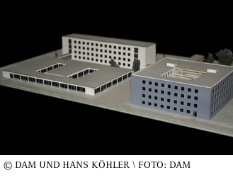 Der elfgeschossige Hochhausriegel der Oberfinanzdirektion (OFD) von Hans Köhler ist einer der markantesten Verwaltungsbauten der Nachkriegszeit in Frankfurt am Main. Die strenge Lochfassade ist mit Keramikplatten in unterschiedlichen Erd-und Rot-tönen verkleidet. Aus Kostengründen wurden dafür Spaltplatten eines handelsüblichen Formats gewählt und von verschiedenen Herstellern preiswerte Fehlfarben-Bestände zusammengetragen. Das Präsentationsmodell entstand 1952/53, es stellt durch seine sorgfältige Detaillierung die Wirkung dieser Fassadengestaltung dar. Die vorspringenden Fenster treten hier allerdings weniger deutlich in Erscheinung als am realisierten Gebäude. Das Modell erweckt den Eindruck, als solle durch das Tarnmuster das strenge Raster der Fenster überspielt und statt der endlosen Reihung der Büros die Großform des Baukörpers hervorgehoben werden. Die rund dreitausend Farbfelder des Kartonmodells wurden mit Wasserfarben ausgemalt. Ebenfalls von Hand wurden das die Felder trennende Linienraster und die Rahmen der rund siebenhundertfünfzig aufgesetzten Fenster aus Kunststoffplättchen ausgeführt. Möglicherweise entstand das Modell für die von der Landesbauverwaltung im Oktober 1954 in Frankfurt veranstaltete Ausstellung neue staatsbauten in Hessen. Die gerade im Bau befindliche OFD dürfte darin eine besondere Rolle gespielt haben – als prominentes Beispiel und als zukünftiger Dienstsitz der obersten Planungsinstanz des Landes. Am Modell finden sich keine Hinweise auf eine Modellbaufirma; es ist durchaus möglich, dass es Köhlers Mitarbeiter ausführten. Ursprünglich wich das Modell in Details, beispielsweise der weißen Sockelzone, von der Bauausführung ab. Die Überarbeitung erfolgte vor 1960, vermutlich im direkten Zusammenhang mit der Planung für einen dreiteiligen Behördenkomplex auf dem Nachbargrundstück. aus: Oliver Elser, Peter Cachola Schmal: Das Architekturmodell – Werkzeug, Fetisch, kleine Utopie, Ausstellungskatalog DAM, Zürich 2012