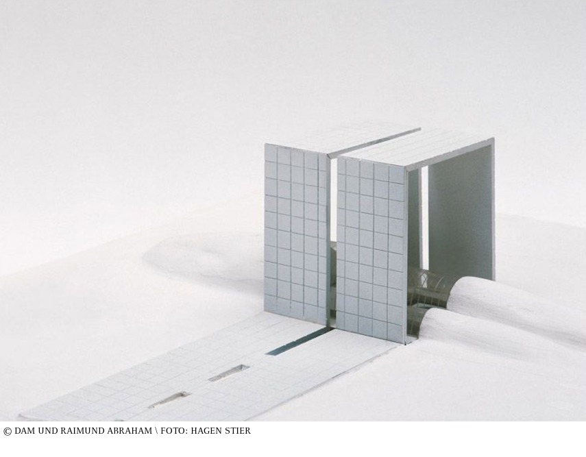 Der Österreicher Raimund Abraham, Professor am Pratt Institute und an der Cooper Union in New York, beschäftigte sich während der 1970er Jahre intensiv mit Entwürfen archetypischer Häuser, die er jeweils befreundeten Künstlern widmete. Damit setzte er der ungeliebten, weitgehend kommerziell geprägten Architektur seiner Zeitgenossen eine neue erzählerische Tiefe entgegen. Die Serie besteht aus neun Häusern in einer kargen Landschaft. Sie können in variablen Anordnungen aufgestellt werden. Das lässt sich beispielsweise auf einer Reihe von zum Teil unveröffentlichten Originalfotografien nachvollziehen, auf denen die Modelle einzeln und in unterschiedlichen Zusammenstellungen abgebildet sind. Diese Fotos belegen auch, dass mindestens zwei weitere Modelle existierten, deren Verbleib bislang unbekannt ist. Raimund Abraham hatte sich in den 1970er Jahren als Künstlerarchitekt mit Zeichnungen und Installationen einen Namen gemacht. nach eigener Aussage war die Zeichnung für ihn eine gleichwertige Entsprechung zur gebauten Architektur: „Wie Piranesi müssen wir noch viel klarer festlegen, dass gewisse Formulierungen der Architektur nur gezeichnet werden können.“ Modelle baue er, so Abraham, hingegen für die Realisierung von Projekten. Da eine Realisierung der hier gezeigten Modelle nie geplant war, stellen sie eine Ausnahme in Abrahams Werk dar. Obwohl belegt ist, dass er die Modelle auch auf Ausstellungen gezeigt hat, sind sie zugleich „Fotomodelle“, da Abraham der fotografischen Interpretation der Modelle große Beachtung schenkte: Teilweise durch dramatische Licht- und Schattensetzung (sogar titelgebend beim Haus mit permanentem Schatten) oder durch die Wahl der New Yorker Stadtsilhouette mit den gleichermaßen archetypischen Formen der Wasserbehälter als Hintergrund. Die meisten der hier gezeigten Fotos befanden sich bisher in jenen Fotobeständen des Deutschen Architekturmuseums, die üblicherweise die Dokumentationsaufnahmen umfassen, die erst nach dem Eingang eines Objekts ins Museum entstehen. nun aber gelten diese Aufnahmen als eigenständige künstlerische Interpretationen der Modelle. (Teresa Fankhänel) aus: Oliver Elser, Peter Cachola Schmal: Das Architekturmodell – Werkzeug, Fetisch, kleine Utopie, Ausstellungskatalog DAM, Zürich 2012