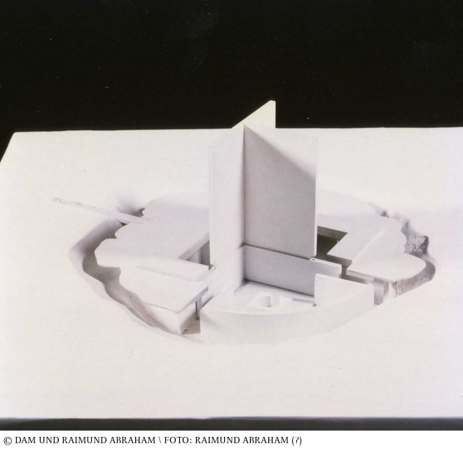 Der Österreicher Raimund Abraham, Professor am Pratt Institute und an der Cooper Union in New York, beschäftigte sich während der 1970er Jahre intensiv mit Entwürfen archetypischer Häuser, die er jeweils befreundeten Künstlern widmete. Damit setzte er der ungeliebten, weitgehend kommerziell geprägten Architektur seiner Zeitgenossen eine neue erzählerische Tiefe entgegen. Die Serie besteht aus neun Häusern in einer kargen Landschaft. Sie können in variablen Anordnungen aufgestellt werden. Das lässt sich beispielsweise auf einer Reihe von zum Teil unveröffentlichten Originalfotografien nachvollziehen, auf denen die Modelle einzeln und in unterschiedlichen Zusammenstellungen abgebildet sind. Diese Fotos belegen auch, dass mindestens zwei weitere Modelle existierten, deren Verbleib bislang unbekannt ist. Raimund Abraham hatte sich in den 1970er Jahren als Künstlerarchitekt mit Zeichnungen und Installationen einen Namen gemacht. nach eigener Aussage war die Zeichnung für ihn eine gleichwertige Entsprechung zur gebauten Architektur: „Wie Piranesi müssen wir noch viel klarer festlegen, dass gewisse Formulierungen der Architektur nur gezeichnet werden können.“ Modelle baue er, so Abraham, hingegen für die Realisierung von Projekten. Da eine Realisierung der hier gezeigten Modelle nie geplant war, stellen sie eine Ausnahme in Abrahams Werk dar. Obwohl belegt ist, dass er die Modelle auch auf Ausstellungen gezeigt hat, sind sie zugleich „Fotomodelle“, da Abraham der fotografischen Interpretation der Modelle große Beachtung schenkte: Teilweise durch dramatische Licht- und Schattensetzung (sogar titelgebend beim Haus mit permanentem Schatten) oder durch die Wahl der New Yorker Stadtsilhouette mit den gleichermaßen archetypischen Formen der Wasserbehälter als Hintergrund. Die meisten der hier gezeigten Fotos befanden sich bisher in jenen Fotobeständen des Deutschen Architekturmuseums, die üblicherweise die Dokumentationsaufnahmen umfassen, die erst nach dem Eingang eines Objekts ins Museum entstehen. nun aber gelten diese Aufnahmen als eigenständige künstlerische Interpretationen der Modelle. (Teresa Fankhänel) aus: Oliver Elser, Peter Cachola Schmal: Das Architekturmodell – Werkzeug, Fetisch, kleine Utopie, Ausstellungskatalog DAM, Zürich 2012