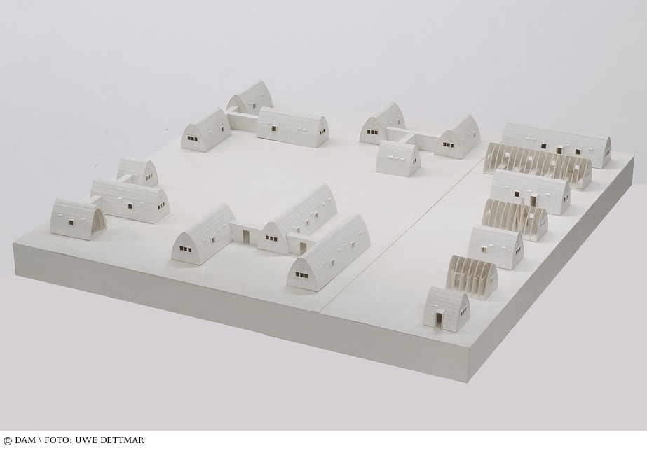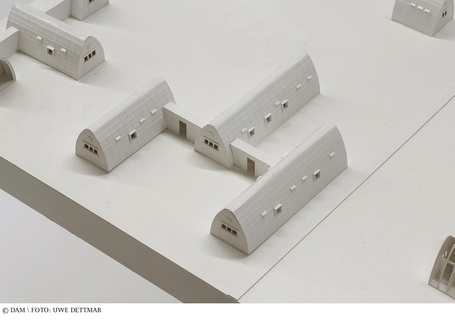 Gemeinsam mit dem Unternehmer G. Blowers nutzte May seine Plattenbau-Erfahrungen aus Frankfurt und entwickelte ein Hausbau-System aus vorfabrizierten Betonelementen. In der Formgebung orientierte May sich an ostafrikanischen Grashütten und entwickelte ein System aus parabolischen Bindern. 90 cm breite Betonplatten wurden in Nuten auf der Innenseite eingehängt und bildeten so die geschwungenen Wände. Hook-on-Slab (Platte mit Haken) zeichnete sich durch enorme Variabilität der Grundrisse und der Ausstattung aus, für die Lüftungsplatten, Fenster- und Türmodule als Elemente zur Verfügung standen. Die Technik der Bauten beeindruckte die Afrikaner; sie erklärten jedoch, lieber in Häusern leben zu wollen, die denen der Europäer glichen. (Philipp Sturm) aus: Claudia Quiring, Wolfgang Voigt, Peter Cachola Schmal, Eckhard Herrel: Ernst May. 1886-1970, Ausstellungskatalog DAM, München 2011
