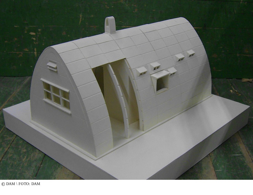Gemeinsam mit dem Unternehmer G. Blowers nutzte May seine Plattenbau-Erfahrungen aus Frankfurt und entwickelte ein Hausbau-System aus vorfabrizierten Betonelementen. In der Formgebung orientierte May sich an ostafrikanischen Grashütten und entwickelte ein System aus parabolischen Bindern. 90 cm breite Betonplatten wurden in Nuten auf der Innenseite eingehängt und bildeten so die geschwungenen Wände. Hook-on-Slab (Platte mit Haken) zeichnete sich durch enorme Variabilität der Grundrisse und der Ausstattung aus, für die Lüftungsplatten, Fenster- und Türmodule als Elemente zur Verfügung standen. Die Technik der Bauten beeindruckte die Afrikaner; sie erklärten jedoch, lieber in Häusern leben zu wollen, die denen der Europäer glichen. (Philipp Sturm) aus: Claudia Quiring, Wolfgang Voigt, Peter Cachol Schmal, Eckhard Herrel: Ernst May. 1886-1970, Ausstellungskatalog DAM, München 2011