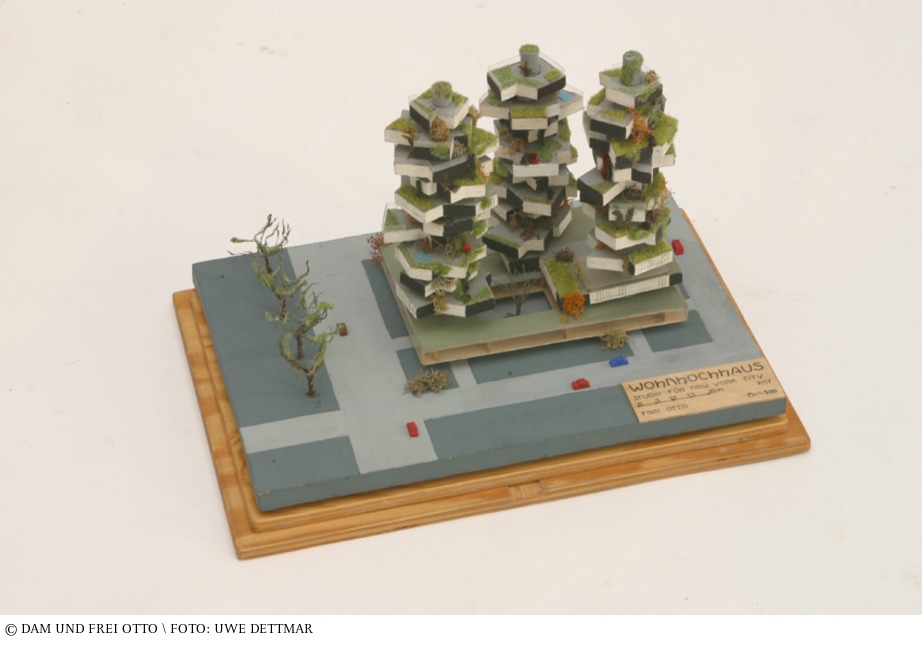 Frei Otto entwarf die Wohnhäuser, die an einem Betonkern zu Hochhäusern aufgereiht sind wie auf einem Schaschlikspieß, während eines Aufenthalts in den Vereinigten Staaten. Konzeptionell erinnert die Studie an die Kapselhäuser von Isozaki, Archigram oder Döring, die Darstellung im Modell unterscheidet sich jedoch deutlich. Nicht das Stakkato gleicher Module interessiert Frei Otto, sondern die Vorwegnahme kleiner grüner Oasen und die individuelle Gestaltung der Wohnungen. Ähnlich präsentierte Entwürfe sind im Frühwerk Friedensreich Hundertwassers zu finden. aus: Oliver Elser, Peter Schmal: Das Architekturmodell – Werkzeug, Fetisch, kleine Utopie, Ausstellungskatalog DAM, Zürich 2012
