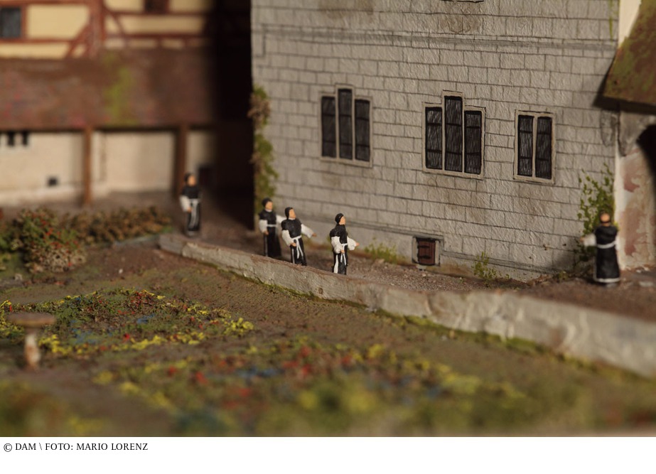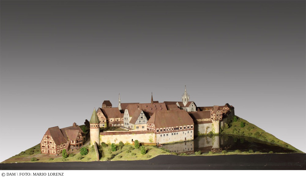 Die Klosteranlage ist neben der Kathedrale Inbegriff einer vom christlichen Glauben geprägten Architektur. Die hier lebenden Mönche und Nonnen bildeten jedoch nicht nur Betgemeinschaften, vielmehr stellten die Klöster im Mittelalter selbstständige Wirtschaftseinheiten und Kulturinseln dar. Das Kloster Bebenhausen bei Tübingen ist eine noch gut erhaltene Großanlage, die sich über Jahrhunderte hinweg entwickelt hat. Mit Klosterkirche, Kreuzgang, Wirtschaftsgebäude und die den ganzen Komplex umgürtende Mauer sind die typischen Bestandteile einer Klosters heute noch vorhanden. Das von Pfalzgraf Rudolf von Tübingen seit 1185 errichtete Kloster Bebenhausen wurde 1191 mit dem Orden der Zisterzienser besetzt. Nach der Lehre ihres Ordensgründers, des heiliggesprochenen Abtes Bernhard von Clairvaux (1090–1153) forderten die Zisterzienser Einfachheit und Demut. Die strengen Ordensregeln fanden auch in der Architektur ihren Niederschlag. Den Bauten lag ein strenges Planschema zugrunde, in dem alles vom rechten Winkel beherrscht wurde. So verzichteten die Zisterzienser bei ihrer Kirche bewusst auf das Halbrund einer Apsis als Abschluss des Chores und gestalteten diesen mit kubischen, aneinandergereihten Kapellen für Einzelandachten und Bußübungen. Die Kirchen wurden in asketischer Einfachheit, ohne dekorativen Schmuck wie beispielsweise bunte Glasfenster oder Malereien und figurale Bauplastik errichtet, denn die Andacht der Gläubigen sollte keinerlei Ablenkung erfahren. Sogar Kirchtürme wurden abgelehnt. Lediglich durch einen aufgesetzten Dachreiter hob sich die Kirche von den umliegenden Gebäuden ab. Wie andere Zisterzienserklöster auch wurde das Bebenhausener Kloster weitab von jeglicher Zivilisation errichtet. Um zu verhindern, dass sich um die Klöster Dorfgemeinden bildeten, wurden die Anlagen in nicht erschlossenen Gegenden wie engen Waldtälern gegründet. So bildeten die Zisterzienserabteien eine nach außen abgeschlossene, völlig autarke Gemeinschaft. Der Idealplan einer Zisterzienserklosteranlage sah im Norden – so auch in Bebenhausen – die Kirche mit einem nach Süden anschließenden Kreuzgang vor. Darum wurden sich die verschiedenen Schlaf-, Ess-. Arbeits- und Wirtschaftsgebäude für ca. 100 Mönche gruppiert. Unter anderem gehörte auch ein Krankenhaus zu dieser Anlage. So einheitlich der Plan für Bebenhausen auch war, so mannigfaltig stellt sich die Ausführung dar, die sich über einen Zeitraum von beinahe 400 Jahren erstreckte (1185–1556) und damit Stilformen von der Spätromanik bis zur Spätgotik aufweist. aus: Christina Budde, Peter Cachola Schmal: Von der Urhütte zum Wolkenkratzer – Eine Geschichte der Architektur in 23 Modellen, Ausstellungskatalog DAM, Frankfurt am Main 2012
