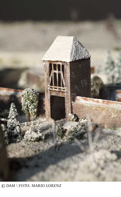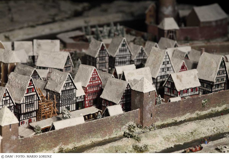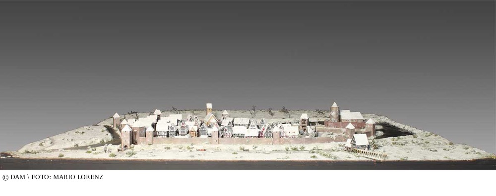 Seit dem 12. Jahrhundert sind in Deutschland zahlreiche Städtegründungen nachweisbar. Die Städte entwickelten sich zu Mittelpunkten des Gewerbebetriebes, förderten die Arbeitsteilung und den Austausch von gewerblichen Produkten durch Märkte und Messen. Zur Kontrolle, Planung und Lenkung der gewerblichen Produktion bildeten sich die Zünfte aus. Entscheidend für den Aufstieg der Städte war ihre gute Wirtschafts- und Verkehrslage im Schnittpunkt von Land-, See- und Flusswegen. Büdingen gehört auch heute noch zu den besonders schönen Beispielen einer kleinen mittelalterlichen Stadtanlage, die in der Nähe eines bedeutenden Verkehrs- und Handelsweges zwischen Frankfurt und Leipzig lag. Die Geschichte und städtebauliche Entwicklung ist mit der Burg und deren Bewohnern eng verbunden. Die Herren von Büdingen, die erstmals 1131 erwähnt wurden, errichteten eine Burganlage, die wohl zwischen 1180 und 1190 vollendet war. Diese staufische Herrenburg setzte sich aus einer hufeisenförmigen Vorburg und einer von einer 13-eckigen Ringmauer umgebenen Kernburg zusammen. Im Westen der Burg, um die ein Wassergraben verlief, entwickelte sich zunächst eine Burgmannensiedlung, dann die Altstadt. Nach der Ernennung zur Stadt im Jahre 1321 wurde Büdingen mit Mauern und Wehrtürmen befestigt. 1330 wurde das Marktrecht erteilt. Handel und Gewerbe florierten, was einen Bevölkerungszuzug und eine damit verbundene rege Bautätigkeit nach sich zog. Infolge der durch die Befestigungsanlage bedingten Enge entwickelten sich die städtischen Wohnhäuser – Fachwerkhäuser mit spitzen Giebeldächern – zu schmalen Reihenhäusern, die die Straßen säumten. Das Modell gibt den Zustand um das Jahr 1390 wieder, der geprägt war von dem Nebeneinander einer staufischen Wasserburg und der davor entstandenen Bürgerniederlassung, beispielhaft für so viele europäische Städte des Mitelalters. aus: Christina Budde, Peter Cachola Schmal: Von der Urhütte zum Wolkenkratzer – Eine Geschichte der Architektur in 23 Modellen, Ausstellungskatalog DAM, Frankfurt am Main 2012