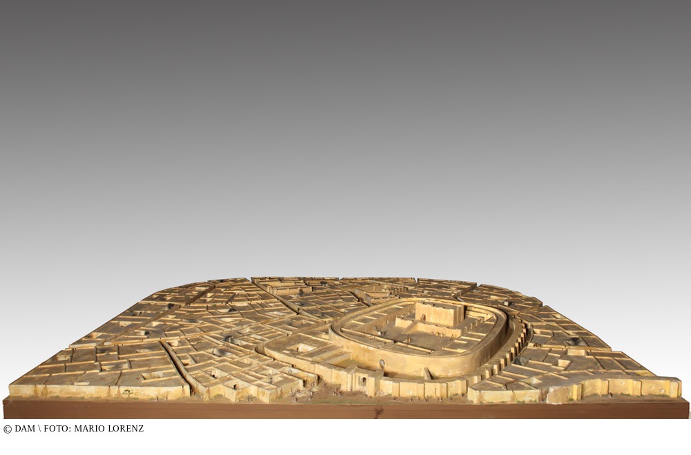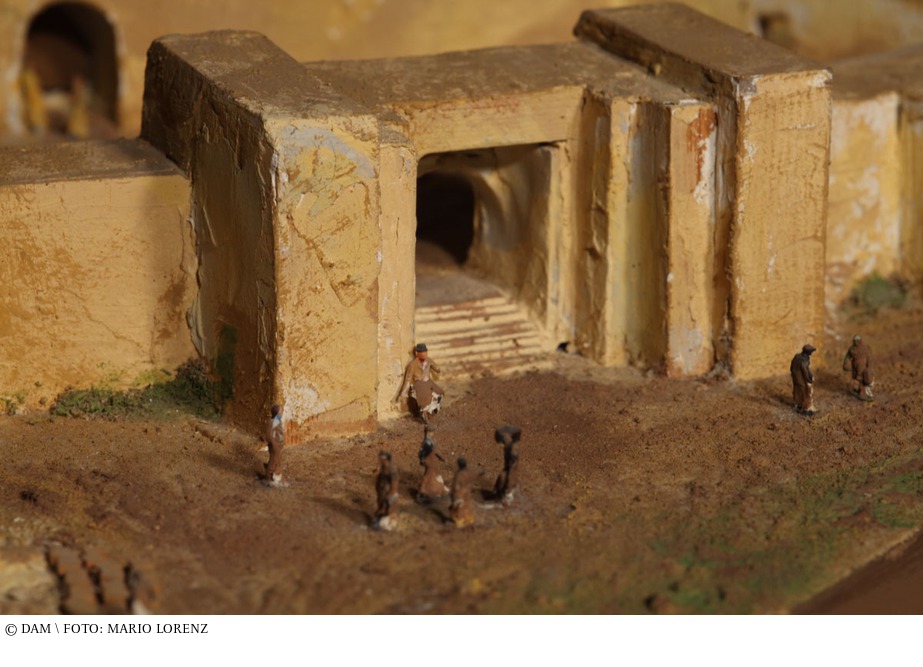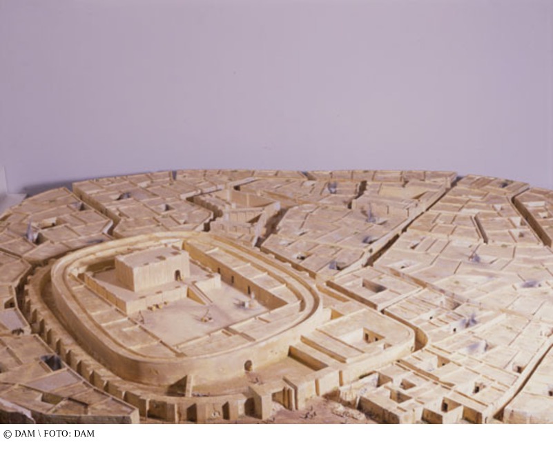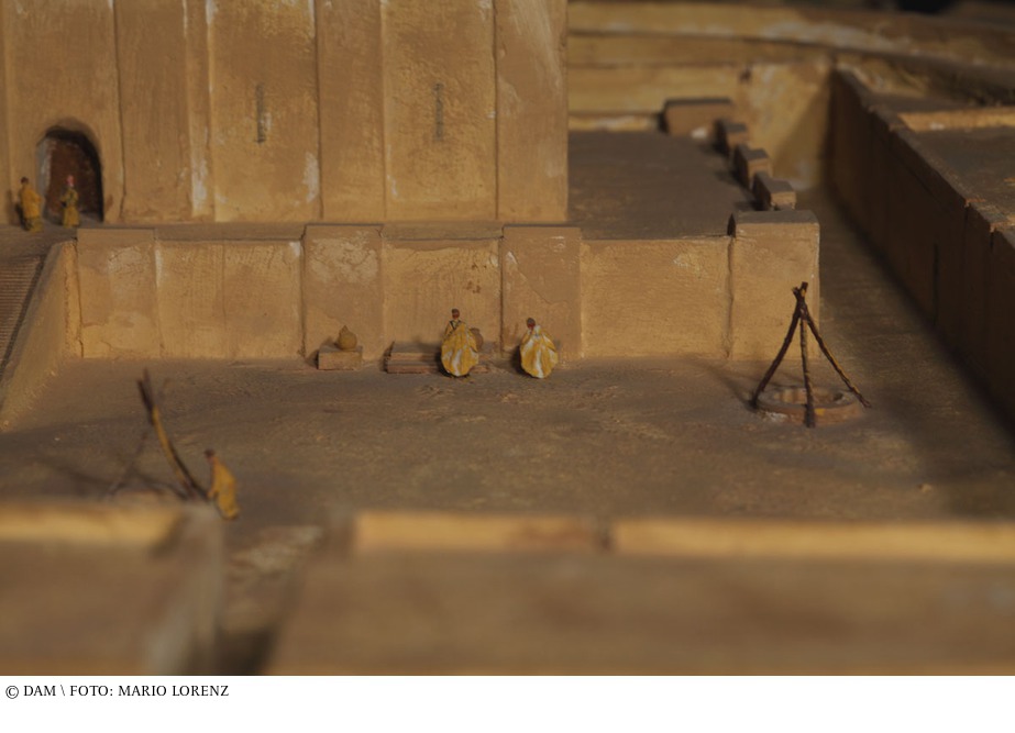 Bereits gegen Ende der Jungsteinzeit hat sich in Mesopotamien eine hierarchisch gegliederte Gesellschaft ausgebildet. Die einzelnen Gesellschaftsschichten – Krieger, Beamte, Handwerker, Händler, Bauern und Sklaven – waren scharf gegeneinander abgegrenzt. An der Spitze dieser Gesellschaftspyramide standen die Tempelpriester, die vom jeweiligen Stadtgott „beauftragt“ waren, die Geschicke des Gemeinwesens zu lenken. Alle Bürger der Stadt, gleichgültig welchen Ranges, waren verpflichtet, ihre Aufgaben im Namen des Gottes wahrzunehmen und Abgaben zu tätigen. Saatkorn, Zugtiere, Geräte und Werkzeug wurden von den Priestern bereitgestellt, im Gegenzug überließen alle Bewohner der Stadt einen Teil ihrer Produkte dem Tempel. Die mesopotamische Stadt Khafājah erlebte als eines der Zentren sumerischer Stadtkultur ihre Blüte während der ersten Hälfte des 3. Jahrhunderts v. Chr. Sie lag an einem Nebenfluss des Tigris und gehörte zu jenen frühgeschichtlichen Großstädten des fruchtbaren Schwemmlandes zwischen Euphrat und Tigris, mit denen die Hochkulturen Mesopotamiens ihren Anfang nahmen. Mit diesen ersten urbanen Zentren der Menschheit entstand auch die herausgehobene, monumentale Architektur wie der im Zentrum der Stadt errichtete Tempel – der politische, religiöse und wirtschaftliche Mittelpunkt der Gemeinde. Mesopotamische Tempelarchitekturen haben eine lange und faszinierende Geschichte: Ihr Ursprung lag in den um ca. 5000 v. Chr. entstandenen winzigen Kapellen von knapp drei Quadratmetern Grundfläche. In einfacher Lehmziegelbauweise errichtet, zeigten diese bereits die Baumerkmale der Tempel späterer Zeit wie etwa die Altarnische mit dem kleinen Opfertisch gegenüber dem Eingang. Unter Beibehaltung dieser Grundelemente wurde in späterer Zeit das Heiligtum vergrößert und stilistisch fortentwickelt: Die Monotonie des Lehmziegelbaus wurde durch den Wechsel von Pfeilern und Nischen unterbrochen, später kam auch Skulpturenschmuck hinzu. Den Höhepunkt bildeten schließlich die gigantischen Zikkurate – künstliche Stufenberge mit Rampen und Treppen, auf denen ein Hochtempel der Gottheit stand. Da jeder Tempel auf den Ruinen seines Vorgängers errichtet wurde, erhoben sich die Nachfolgebauten auf erhöhten Plattformen und überragten die umgebenden Häuser. Die hier rekonstruierte Tempelanlage von Khafājah, von der nur noch Teile der Terrasse erhalten sind, stellt ein typisches Beispiel dieser Architekturform dar. Die Tempelanlage, die dem Mondgott Sin geweiht war, umgab eine ovale Außenmauer, die den heiligen Bezirk mit den zugehörigen Anlagen umschloss. Das rechteckige Heiligtum mit Altar, Opfertisch und dem Eingang bildete auch hier das Grundelement des Aufbaus. Hinzu kamen jedoch noch seitliche Kammern und Treppen, die zum Flachdach hinauf führen, sowie ein von weiteren Gebäuden umgebender Hof. Der im Zentrum errichtete Tempel überragt Khafājah als Stadtkrone. Er war das religiöse und politische Zentrum der Stadt. aus: Christina Budde, Peter Cachola Schmal: Von der Urhütte zum Wolkenkratzer – Eine Geschichte der Architektur in 23 Modellen, Ausstellungskatalog DAM, Frankfurt am Main 2012