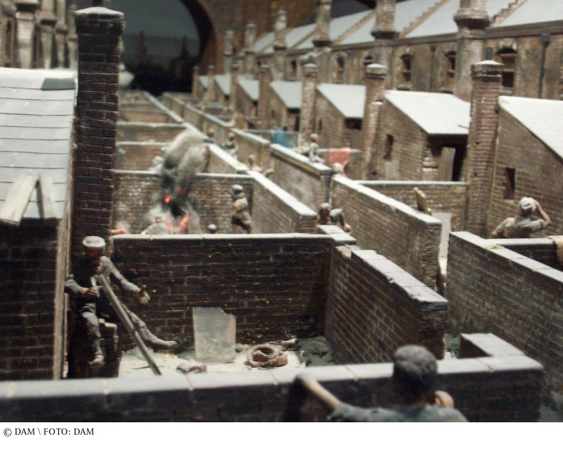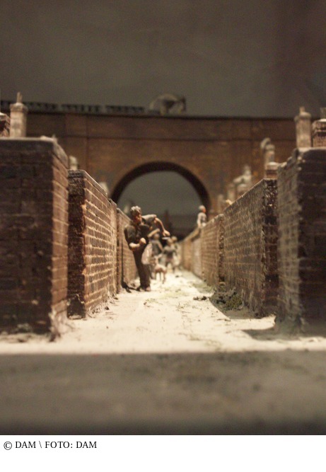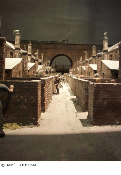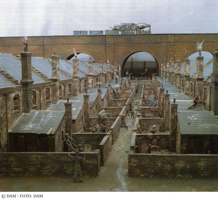 Mit der industriellen Revolution entstanden bereits während des ausgehenden 18. Jahrhunderts in den neuen englischen Industriestädten wie Manchester, Liverpool und London die Elendsviertel des Industrieproletariats. Die Elendsviertel der neuen Industriestädte waren das Ergebnis rücksichtsloser Ausbeutung. Der Slum wurde zu einem Ort,der Krankheiten, des Hungers und der Menschenverachtung. Paul Gustave Doré (1832–1883), der bedeutendste französische Illustrator seiner Zeit, lebte von 1868 bis 1870 in England. Für eine Reportage von Blanchard Jerrolds „London, a Pilgrimage“ durchwanderte er London, um in Elendsquartieren, Armenhäusern, Nachtasylen, in Fabriken und Häfen die Lebensumstände des Proletariats zu beobachten und zeichnerisch zu dokumentieren. Seine Sicht auf die Schattenseiten des industriellen Kapitalismus bildet bis heute die geeignetste optische Ergänzung zu Friedrich Engels Werk „Lage der arbeitenden Klasse in England“ (1845). Darin schreibt dieser unter anderem über die in Lumpen gekleidete, in „Höhlen und Löchern“ wie „Tiere hinvegetierende“ arbeitende Klasse: „In den niedrigen Logierhäusern schlafen 10, 12, ja zuweilen 20 Personen von beiden Geschlechtern und jedem Alter in verschiedenen Abstufungen der Nacktheit auf dem Fußboden durcheinander. Diese Wohnstätten sind meist so schmutzig, feucht und verfallen, dass kein Mensch sein Pferd darin unterbringen möchte. […] Das Bett war eine Lage modrigen Strohs, mit einigen Lumpen vermengt. […] Fünf bis sieben Betten liegen in jedem Zimmer ohne Bettstellen auf der Erde, und darauf werden so viele Menschen gelegt, wie sich finden, und alles durcheinander. Jedes dieser Häuser ist ein Locus des Verbrechens und der Schauplatz von Handlungen, die die Menschlichkeit empören, und vielleicht ohne diese gewaltsame Zentralisation der Unsittlichkeit nie zur Ausführung gekommen wären. […] Die Kleidung der Arbeiter ist bei der ungeheuren Majorität in sehr schlechtem Zustande. […] Gewöhnlich hängen die Lumpen des Hemdes durch die Risse des Rocks oder der Hosen heraus. […] Wie mit der Kleidung, so mit der Nahrung. […] Der Abfall der Seifensiedereien wird mit anderen Stoffen vermischt und als Zucker verkauft, […] Pfeffer wird mit Staub von Hülsen verfälscht […], Gips und Kreide unter das Mehl gemischt.“ (zitiert nach Farner, S. 239) Das nach einer Zeichnung des französischen Malers und Grafikers Gustav Doré rekonstruierte Modell zeigt einen Londoner Slum, wo die vom Land in die Stadt gezogenen Arbeiter auf engstem Raum unter ärmlichen Umständen ihr Leben fristen mussten. aus: Christina Budde, Peter Cachola Schmal: Von der Urhütte zum Wolkenkratzer – Eine Geschichte der Architektur in 23 Modellen, Ausstellungskatalog DAM, Frankfurt am Main 2012