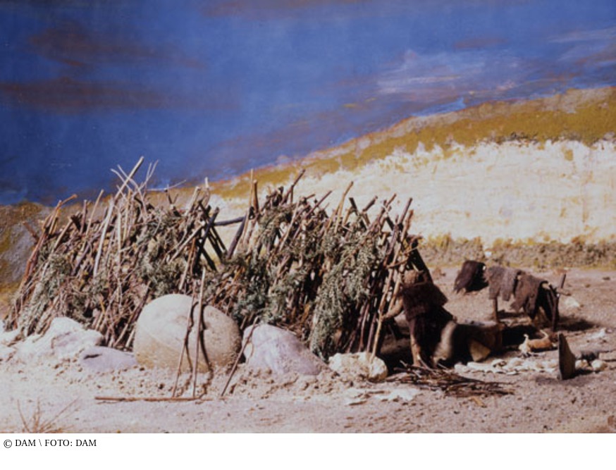 Die ältesten nachweisbaren Spuren menschlichen Aufenthalts wurden 1966 bei Ausschachtungsarbeiten für den Neubau eines Appartementhauses in Nizza an der französischen Riviera gefunden. Auf einem Ausgrabungsgelände von 120 Quadratmetern konnten die Archäologen in einer Erdschicht in 15 bis 21 Metern Tiefe neben dem ältesten je gefundenen Fußabdruck insgesamt 21 übereinander liegende Wohnebenen ausmachen, die in einem Zeitraum von ca. 100 Jahren entstanden sein müssen. Dieser Ort war aufgrund einer artenreichen Tierwelt und einer Süßwasserquelle für einen temporären Aufenthalt offenbar sehr geeignet gewesen. Die Menschen der Altsteinzeit lebten in kleinen, umherziehenden Horden, die ihre Nahrung nicht erzeugten, sondern sammelten und jagten. Sie wohnten in Höhlen, unter Felsdächern oder in Hütten. Wie diese Hütten gebaut waren, davon zeugen die archäologischen Funde in Nizza. Die älteste ausgegrabene und hier nachgebaute Behausung hatte eine Grundfläche von 6 auf 12 Metern. Das Dach wurde wahrscheinlich von zwei oder mehreren Astgabeln gebildet, auf denen ein Stamm als First auflag. Ringförmig um den Boden der Hütte lagen Steine, die die Wände sicherten. Diese bestanden aus dicht nebeneinander in den Boden gesteckten Zweigen und Schösslingen. Die Dachschrägen waren wahrscheinlich mit Laub und Fellen bedeckt. Gegen die Kälte half ein Feuer, das in einer Feuerstelle in der Mitte der Hütte entfacht wurde. Um sie herum schliefen vermutlich die Bewohner, da ansonsten überall, nur hier keine Überreste von Speiseabfällen gefunden wurden. Rekonstruktion einer Hütte des Homo erectus nach den Befunden einer archäologischen Grabung. aus: Christina Budde, Peter Cachola Schmal: Von der Urhütte zum Wolkenkratzer – Eine Geschichte der Architektur in 23 Modellen, Ausstellungskatalog DAM, Frankfurt am Main 2012