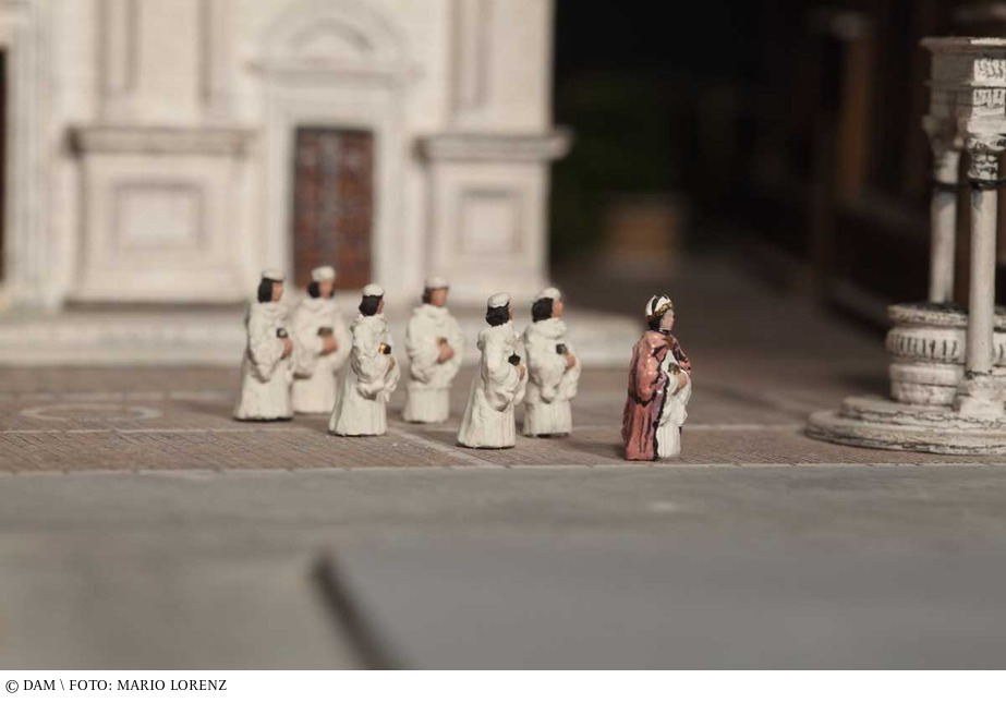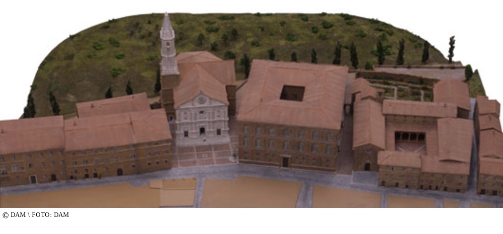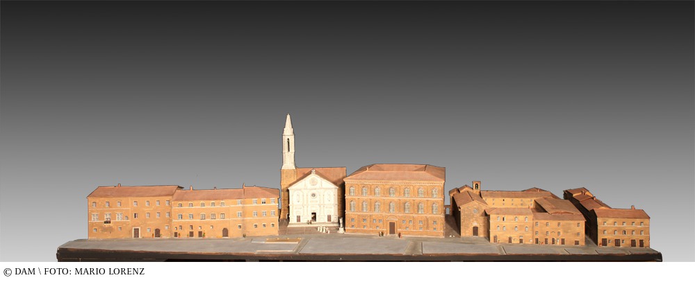 Mit der Renaissance beginnt der Aufbruch in eine neue Zeit. Die Menschen entdeckten mit ihren großen Reisenden wie Columbus und Marco Polo nicht nur die Welt, sondern vor allem sich selbst (Humanismus). Der Renaissancemensch entwickelte sich zum Individuum, das nun auch im privaten Bereich Zeugnis seiner gesellschaftlichen Stellung ablegen wollte. Man bediente sich dazu des Baumeisters, der inzwischen eine Wandlung vom Handwerker zum Künstler vollzogen hatte. In Italien begann die Zeit der Palazzi, der Stadthäuser, die als Profanbauten ebenbürtig neben die Sakralbauten traten. Alle Gebäude wurden in klaren harmonischen Verhältnissen und Formen errichtet, wobei man sich des Formenapparates der römischen Antike bediente, ohne diesen jedoch zu kopieren. Pienza, ursprünglich Corsignano, bestand in seinen wesentlichen Teilen aus Bauten des 13. und 14. Jahrhunderts, als der hier geborene Humanistenpapst Pius II. aus dem Hause Piccolomini seinen Heimatort in eine Stadt umwandeln wollte. Für sein ehrgeiziges Bauprogramm gewann er den Florentiner Architekten Bernardo Rossellino, der im Jahre 1459 mit der Gestaltung des zentralen Platzes begann, umgeben von Dom, Papstpalast, Rathaus und Bischofspalast, dem Familiensitz der Piccolomini. Diese Form der Platzgestaltung stellt das städtebauliche Ideal der Renaissance dar, da sie dem in jener Zeit einsetzenden Verlangen nach harmonisch proportionierter Regelmäßigkeit entsprach. Pienza gilt als eine gelungensten Verwirklichungen dieses Ideals, womit sich Papst Pius II. nicht zuletzt ein Denkmal setzte. Dom, Bischofspalast und Papstpalast bilden eine symmetrische, monumental herausgehobene Platzanlage, die sakrale und öffentlichen Bauten gleichermaßen in eine rational durchdachte und optisch wirksame Ordnung bringt. Pienza, in den Bergen Mittelitaliens gelegen, ist die erste geplante Stadt der Renaissance. aus: Christina Budde, Peter Cachola Schmal: Von der Urhütte zum Wolkenkratzer – Eine Geschichte der Architektur in 23 Modellen, Ausstellungskatalog DAM, Frankfurt am Main 2012