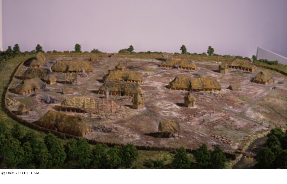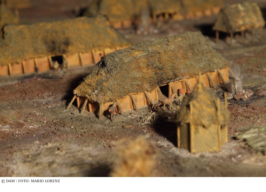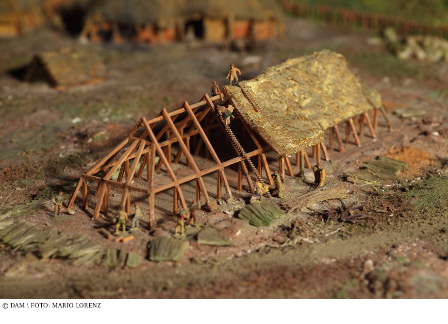 Als Zeugen frühmittelalterlicher Architektur sind durch die von Kaiser Karls des Großen gezielt geförderte Missionstätigkeit vor allem Kirchenbauten erhalten. Infolge des von Bonifatius verbreiteten christlichen Glaubens entstanden zunächst Holzkirchen, die später durch monumentale Steinarchitektur ersetzt wurde. Daneben existieren noch Pfalzanlagen, die der Kaiser als Domizile für den umherziehenden Hofstaat errichten ließ. Der Kontrast zu den bäuerlich geprägten Siedlungen der germanischen Stämme, die sich um die Zentren wie Pfalzen, Dome und Klöster gruppierten, konnte vermutlich nicht größer sein. Soweit sie aus Holz errichtet waren, haben sie die Zeit nicht überdauert. Archäologische Ausgrabungen liefern einige wenige Anhaltspunkte, die sich jedoch häufig auf eine topografische Fixierung beschränken. Umso bedeutender ist es, dass bei Ausgrabungsarbeiten in der Nähe von Warendorf in den Jahren 1951–54 große Teile einer frühmittelalterliche Siedlung aus der zweiten Hälfte des 7. Jahrhunderts bis um 800 n. Chr. entdeckt werden konnten. Von dieser Siedlung, die sich aus mehreren Gehöften zusammensetzte, kamen annähernd 200 Grundrisse vollständig oder in Resten zutage. Für die Archäologen überraschend war die unerwartete Vielzahl unterschiedlicher Hausgrundrisse, die über Längen zwischen 14 und 29 Metern und Breiten zwischen 4,5 und 7 Metern verfügten. Bisherige Vorstellungen, die von primitiven Bauformen des Frühmittelalters bei profanen Gebäuden ausgehen, mussten demzufolge revidiert werden. So konnte man beispielsweise große, fast hallenartige Häuser rekonstruieren, die wie Zelte mit schräg stehenden Pfählen errichtet wurden. Je nachdem, wie breit die Grundrisse waren, musste mit senkrechten Pfosten abgestützt werden, wobei die äußeren Pfosten für die Konstruktion der Wände dienten. Die Dächer hatte man mit Stroh, Heide oder Schindeln gedeckt. In der Mitte der Längsseiten befanden sich zwei vorstehende Ausbauten, von denen der nördliche als Windfang diente, während der südliche wahrscheinlich den Ehrenplatz des Familienoberhauptes beherbergte. Im Osten des Gebäudes befand sich der Herd. Neben den Wohngebäuden existierten ähnlich große Bauten, die als Scheunen oder Ställe dienten. Sogenannte Grubenhäuser, die etwa einen Meter tief in der Erde eingelassen waren, benutze man wahrscheinlich als Spinn- oder Webkammern oder auch zur Vorratshaltung. Kleine offene Schuppen sowie sechs- bis achteckige Hütten mit Speicherrosten für Getreide- oder Heuberge vervollständigten die Anlage. Die Gebäude waren fast ausschließlich in Ost-West-Richtung angeordnet, um den vorherrschenden Westwinden möglichst wenig Angriffsfläche zu bieten. Die Holzbauten, aus denen sich dieses frühmittelalterliche Gehöft zusammensetzt, waren nur noch in Spuren erhalten geblieben und wurden von den Archäologen nach den im Erdreich sichtbar gebliebenen Pfostenlöchern des Fachwerkgerüstes und weniger Holzreste rekonstruiert. aus: Christina Budde, Peter Cachola Schmal: Von der Urhütte zum Wolkenkratzer – Eine Geschichte der Architektur in 23 Modellen, Ausstellungskatalog DAM, Frankfurt am Main 2012