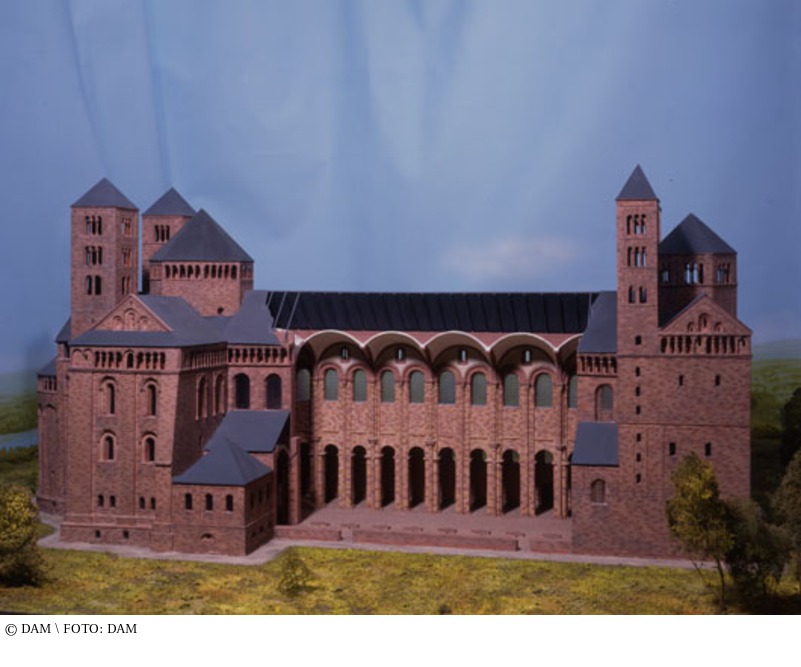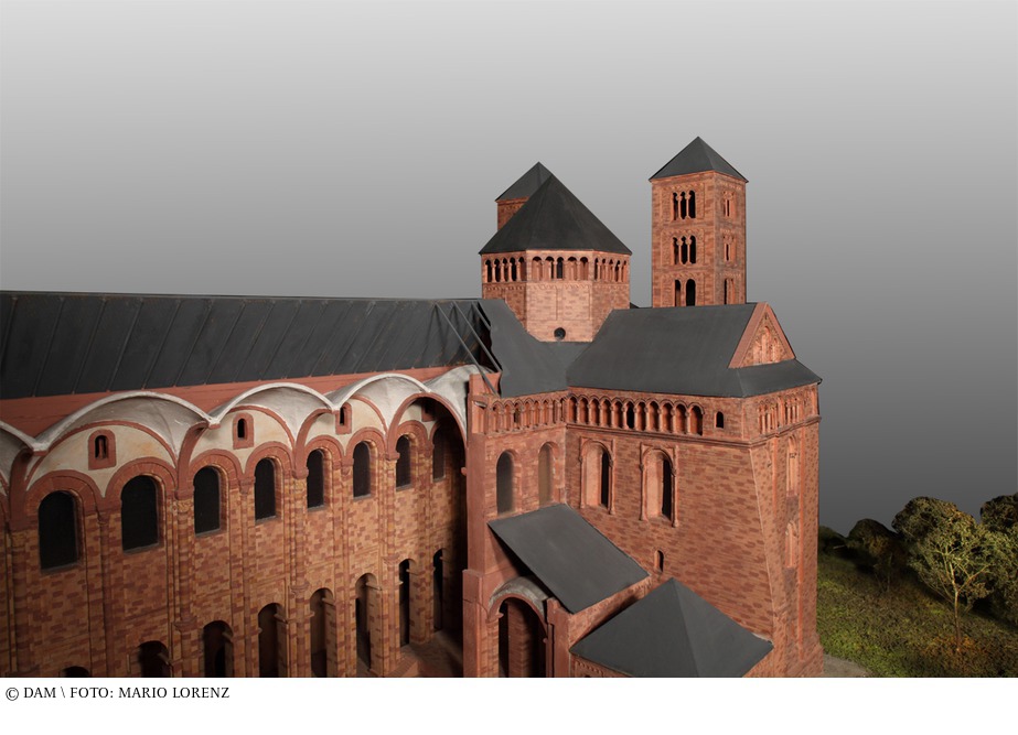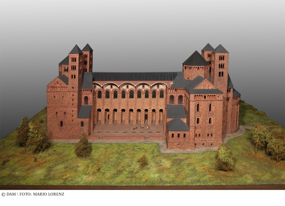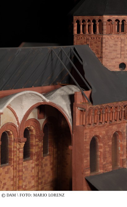 Die romanische Baukunst entwickelt sich ab dem 10. Jahrhundert auf deutschem Herrschaftsgebiet in drei Phasen, die nach dem jeweils regierenden Kaisergeschlecht benannt sind. Man spricht von ottonischem, salischem und staufischem Stil. Die erhaltenen romanischen Gebäude – wie vor allem Kirchen und Burgen – sind allesamt durch eine deutliche Formensprache gekennzeichnet: mächtige und wuchtige Formen, dicke Mauern mit wenigen, kleinen Fenstern, gedrungene Stützen oder Säulen mit schweren Würfelkapitellen und die typischen Rundbögen. Das größte und eindruckvollste Beispiel dieser Bauepoche in Deutschland ist der Dom St. Maria und St. Stephan in Speyer. Er wurde von den Saliern erbaut und galt schon während des Mittelalters als Vorbild europäischer Kathedralenarchitektur. 1030 von Kaiser Konrad II. begonnen und von Kaiser Heinrich III. nahezu vollendet. Als Grabstätte für verstorbene Kaiser der Salier, Staufer und auch der ersten Habsburger wurde der Dom im Mittelalter zum Symbol des Kaisertums schlechthin. Insgesamt fanden hier acht Herrscher des Heiligen Römischen Reiches sowie deren Familienangehörige ihre letzte Ruhestätte. In einem zweiten Bauabschnitt nahm Kaiser Heinrich IV. bald nach 1082 die Bauarbeiten wieder auf und führte sie bis zu seinem Tode 1106 fort. Die ursprüngliche flache Holzdecke im Mittelschiff wurde durch eine steinerne Gewölbedecke ersetzt, der Außenbau erhielt seine charakteristischen Türme und über den Fensterzonen wurden von kleinen Säulen gegliederte Laufgänge eingezogen, die sogenannten Zwerggalerien. Form und Aussehen des ca. 134 Meter langen Doms haben sich in den folgenden Jahrhunderten aufgrund vieler Zerstörungen (1159, 1689 und 1794) immer wieder verändert. Wie bei Kirchenbauten im Mittelalter üblich, gleicht auch der Speyerer Dom im Grundriss der Form eines großen lateinischen Kreuzes. Drei lang gezogenen Schiffen wurde im Osten ein weit ausladendes Querschiff mit anschließender runder Apsis und im Westen ein dreiteiliger Westquerbau (Eingangsfront) vorgelegt. Unter dem ganzen Ostteil des Bauwerks liegt eine Unterkirche, die sogenannte Krypta, die 1041 geweiht worden war und als Grablege diente. Über den Vierungen im Westen und Osten erheben sich Vierungstürme. In den Winkeln ragen je zwei mächtige eckige Türme empor. Der Speyerer Dom ist ein Beispiel für die bedeutendste Bauaufgabe des europäischen Mittelalters, der Kathedrale. Als Repräsentationsbau der salischen Kaiserdynastie wurde er zum großen Vorbild mittelalterlicher Kathedralenarchitektur. aus: Christina Budde, Peter Cachola Schmal: Von der Urhütte zum Wolkenkratzer – Eine Geschichte der Architektur in 23 Modellen, Ausstellungskatalog DAM, Frankfurt am Main 2012