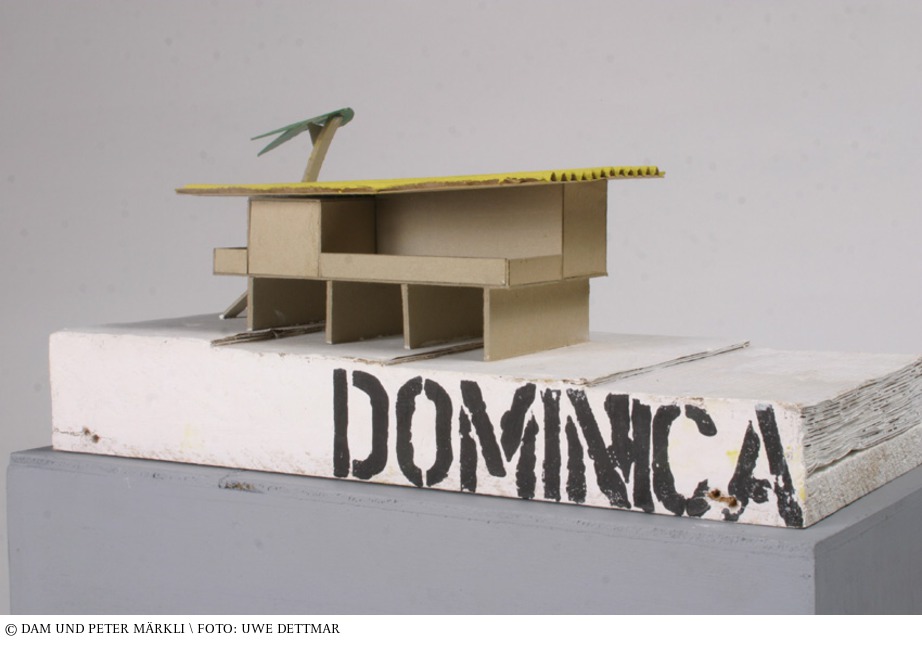 Der Charme dieses Modells entsteht durch die unerschrockene Verbindung von abstrakten Elementen mit konkreten Dingen wie der Palme und dem Wellblechdach, Inbegriff vom Bauen in Entwicklungsländern schlechthin. Peter Märkli entwirft alle seine Projekte mit Zeichnungen, die auf den ersten Blick naiv wirken. Sie erfassen die besondere Situation eines Ortes und umreißen ein Konzept. Die Form der Ausführung, das Ringen um Details – all das kommt später. Auch das Modell zeigt nicht mehr als das Konzept. Woraus jene Teile des Hauses erstellt werden sollten, die im Modell aus grauer Pappe dargestellt sind, erfährt man nicht, dafür ist das gelbe Wellblechdach als Stimmungsträger bereits „fertig“, ein Ready-made. Der Schutz vor Sonne und Regen hat in dem tropischen Klima eine sehr viel existenziellere Bedeutung als die Frage, ob die darunter liegende Struktur in Beton, Stein oder Holz gebaut wird. (Oliver Elser) aus: Oliver Elser, Peter Cachola Schmal, Das Architekturmodell – Werkzeug, Fetisch, kleine Utopie, Ausstellungskatalog DAM, Zürich 2012