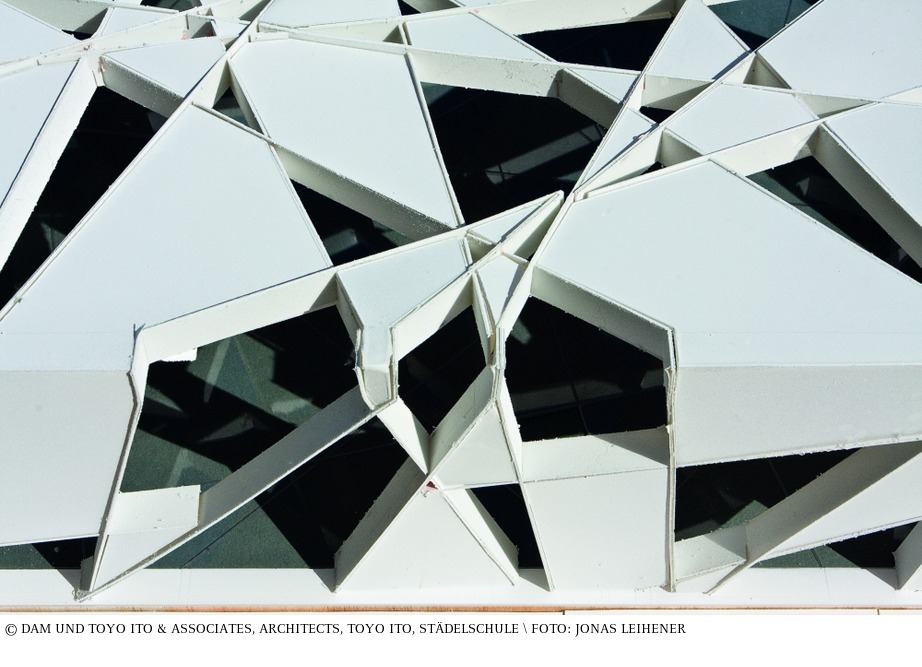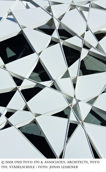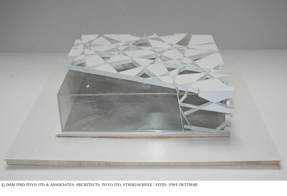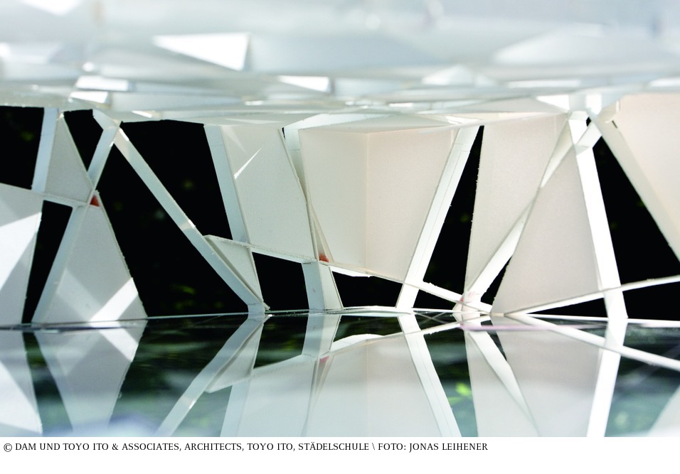 Mit dem Entwurf des Serpentine-Pavillons von 2002 warf Toyo Ito zwei Fragen auf: Wie lässt man eine Bodenplatte schweben und wie baut man eine »Box« ohne Stützen? Die Planung wurde entwickelt, indem man die Grenzen der »Box« als zweidimensionales Feld definierte und dieses durch einen Rotationsalgorithmus transformierte, um ein Netzwerk sich kreuzender Linien zu beschreiben. Dieses nahm die Geometrie der Struktur vorweg. Das entstehende Gitter wurde nach innen gefaltet, um die »Box« zu definieren. Die Konstruktion, bestehend aus verschweißten Stahlflachstäben, wurde an den Ecken des Baukörpers verschraubt und teilweise mit drei Millimeter starken Aluminiumplatten und Glas verkleidet. Im Anschluss wurde die gesamt Konstruktion weiß gestrichen, wobei zwanzig Prozent der Öffnungen im Gitter offen gelassen wurden. Das resultierende konstruktive Netz beugte mit seinem dichten und unregelmäßigen Muster dem strukturellen Risiko des Brechens der Flachstäbe vor. Anders als bei einer klassischen »Box-Konstruktion« wurden der Rand und die Ecksituationen örtlich verändert, sodass sie als immateriell erschienen und sich teilweise völlig auflösten. (Ali Kashani) aus: Peter Cachola Schmal: Der Pavillon – Lust und Polemik in der Architektur, Ausstellungskatalog DAM, Ostfildern 2009