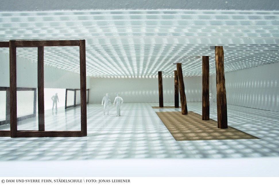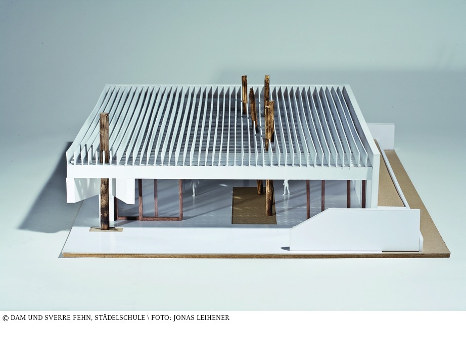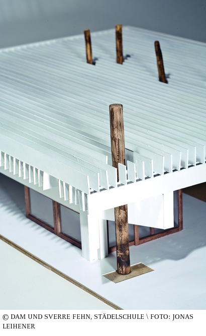 Der Nordische Pavillon in Venedig ist ein Raum aus Licht. Das Dach des Gebäudes schützt die Ausstellungsfläche vor direktem Sonnenlicht und deutet die Atmosphäre der »schattenlosen« Welt der nordischen Länder an. Zwei verstärkte Betonstützwände rahmen den Raum, der sich auf den beiden anderen Seiten zur Umgebung öffnet und um eine einzelne Säule und einen Hauptbalken längs der Umfassung arrangiert ist. Ein Dach aus Betonlamellen ruht auf diesen Konstruktionsstützen. Es dient als konstruktives Element und als architektonischer Filter für die klimatische Situation. Mehrere Bäume, um die herum der Pavillon gebaut wurde, durchbrechen das Dach und bilden die charakteristischen Hauptelemente, die den Ausstellungsraum gliedern. Der Aufbau ist in gleich hohe horizontale Proportionen geschichtet. Ein biaxiales Lamellengitter in dem die einzelnen Elemente einen Abstand von 52,3 Zentimetern haben, bildet einen zweischichtigen Sonnenschutz, der eine Höhe von zwei Metern hat. Die Elemente sind einen Meter hoch und haben sechs Zentimeter dicke Balken (Lamellen). Die verwendeten Materialien sind weißer Beton, weißer Sand und zerstoßender Marmor. Fiberglasscheiben sind zwischen die oberen Reihen der Lamellen eingelassen, um als Abflussrinne zu dienen. (Dushyant Asher) aus: Peter Cachola Schmal: Der Pavillon – Lust und Polemik in der Architektur, Ausstellungskatalog DAM, Ostfildern 200